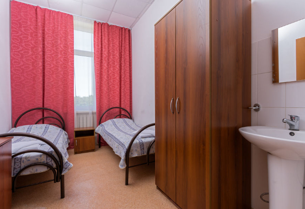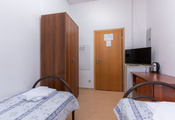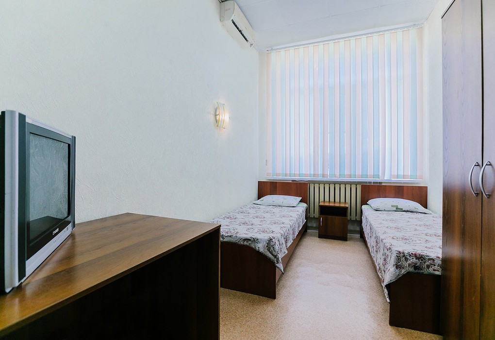 Площадь номера - 10 кв.м. 1 комната. 2 осн. места. санузел и душевые на этаже (на 7 номеров 2 санузла и 2 душевые в одном крыле и 1 санузел и 1 душевая во втором крыле). В номере: телевизор; кондиционер; 1-спальные кровати.