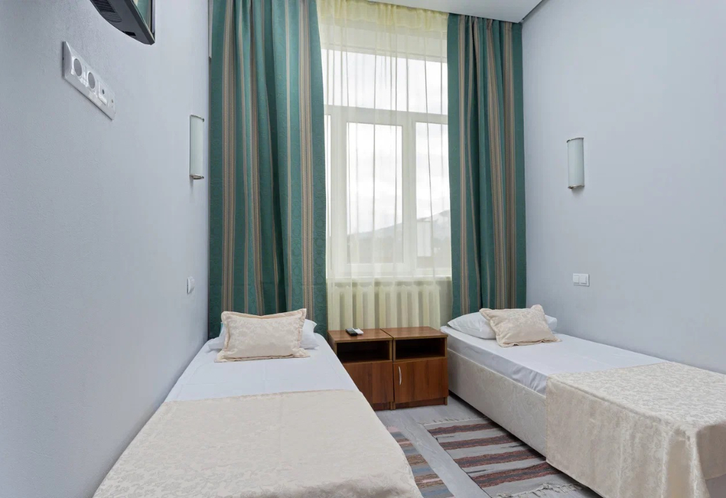 Площадь номера - 13 кв.м. 1 комната. 2 осн. места. В номере: телевизор; холодильник; кондиционер; душ/ванна; 1-спальные/ 2-спальная кровать; санузел; чайный набор.